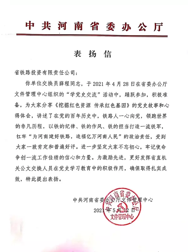 近日,河南鐵投收到一封來自省委辦公廳文件管理中心的表揚信。信中對機要交換員薛程同志在“學黨史交流”活動中的表現予以表揚。
